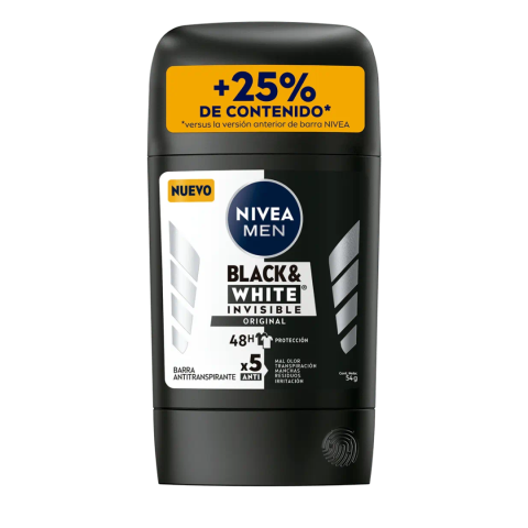 Desodorante NIVEA Men Barra Black & White Fresh. Protección 48 h sin manchas. Ideal para negocios y uso diario. Despacho en la RM. Imágenes referenciales.