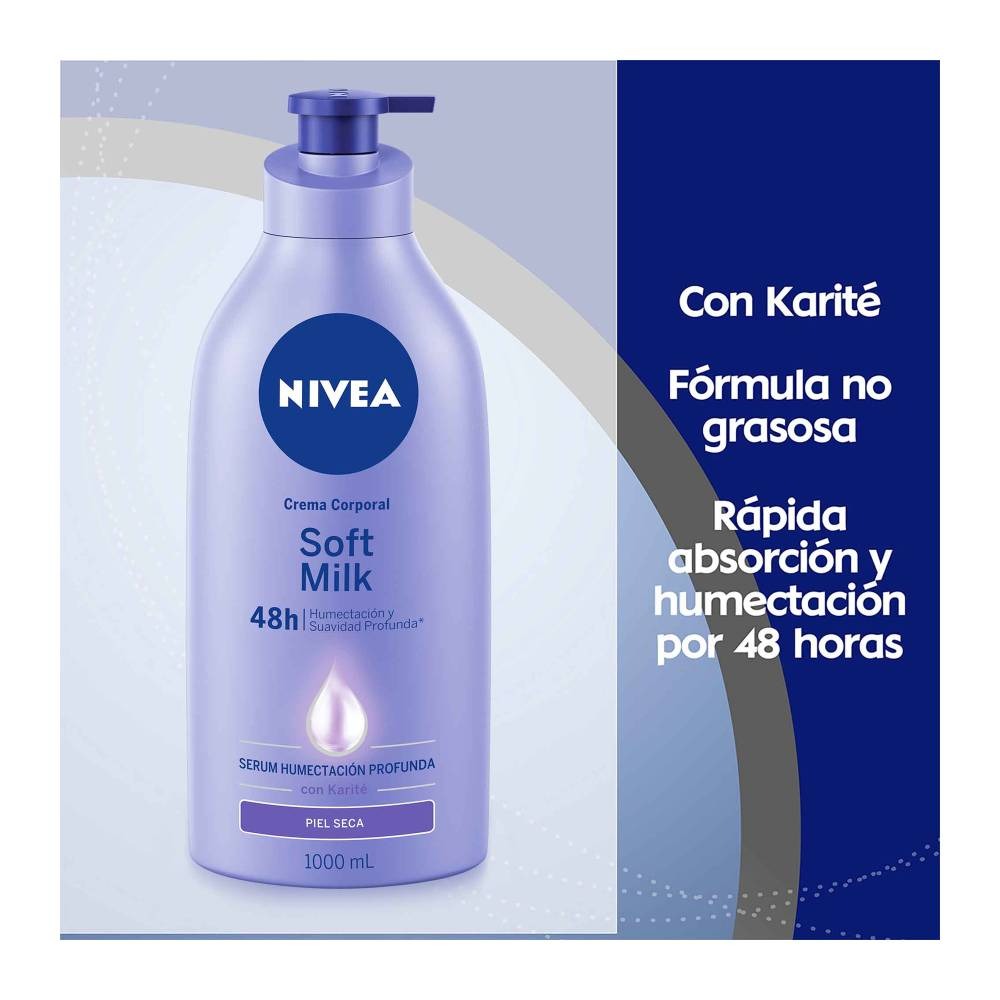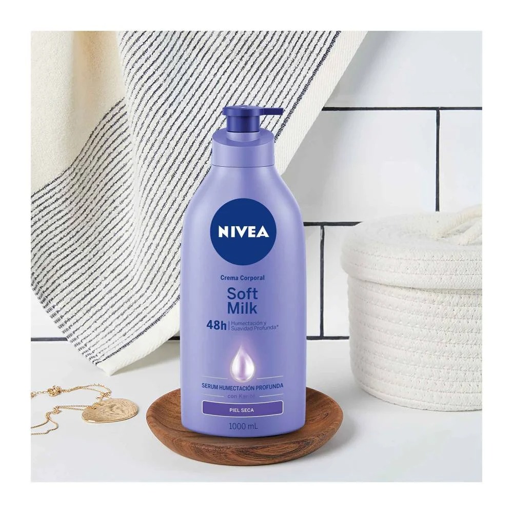 La Crema Corporal NIVEA Soft Milk 1000 ml entrega una hidratación profunda y duradera, ideal para piel seca a muy seca. Su fórmula enriquecida con aceite de almendras naturales y el exclusivo Deep Moisture Serum de NIVEA nutre intensamente la piel, dejándola suave, flexible y con una agradable sensación de bienestar durante todo el día.