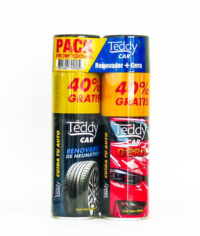 Pack TEDDY con renovador de neumáticos + cera automotriz. Brillo y protección para tu vehículo.Caja con 6 packs.Despacho dentro de la Región Metropolitana.Imágenes referenciales.