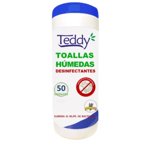 Las Toallas Húmedas Desinfectantes Teddy eliminan el 99.9% de virus y bacterias, ofreciendo limpieza y protección efectiva en cualquier superficie. Presentación en tarro de 50 unidades, caja con 12 tarros.