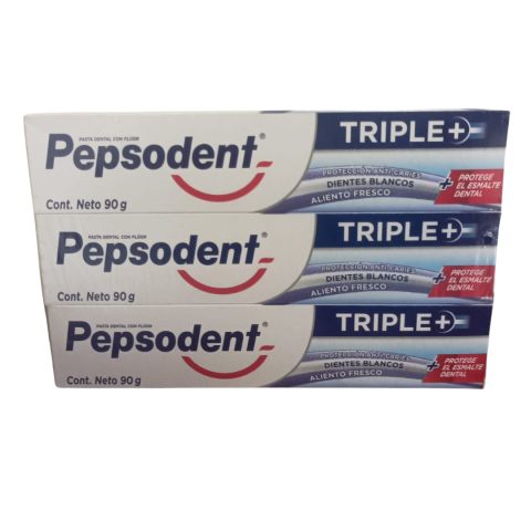Pepsodent Triple+ Pack X12 (cada pomo de 90 g) ofrece protección total contra caries, placa y problemas de encías. Fortalece el esmalte y refresca el aliento. ¡Sonrisa sana todos los