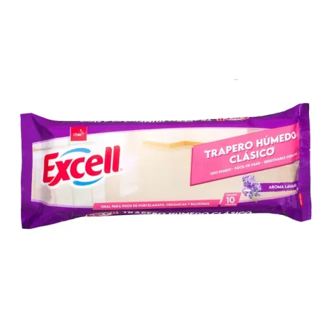 Trapero Húmedo Excell Lavanda Piso Flotante X10 Caja 10 PaquetesLos Traperos Húmedos Excell Lavanda son ideales para la limpieza de pisos flotantes. Cada paquete contiene 10 unidades con una agradable